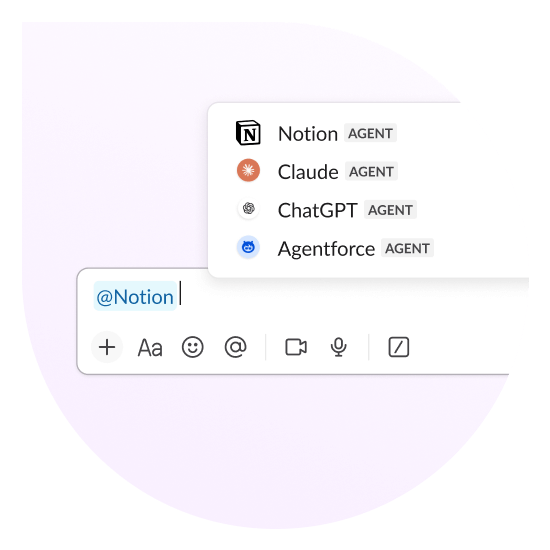 By connecting them to your conversations and data in Slack, agents like Agentforce, ChatGPT, Claude, Notion, Slackbot and Writer become even more powerful and context-aware by being able to instantly (and securely) surface relevant information right where you work.