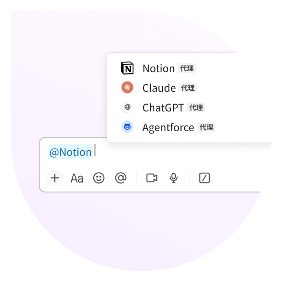 通过将代理与你在 Slack 中的对话和数据相关联,Agentforce、ChatGPT、Claude、Notion、Slackbot、Writer 等代理将变得更加强大且具备上下文感知能力,能够在你的工作场景中即时(且安全地)呈现相关信息。