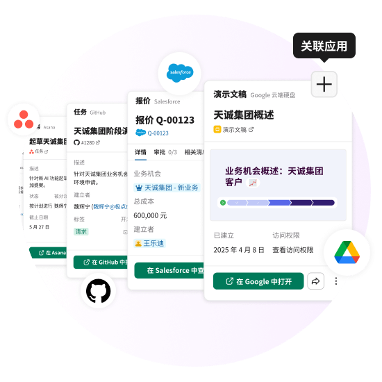 工作对象重新构想了应用数据在 Slack 中的共享方式。你不再只是看到简单的链接,而是能在对话中直接获取来自 Asana、Pagerduty、Box、Highspot 等应用的丰富交互式预览。编辑记录、将任务标记为完成,甚至审批请求,都可以一个平台上完成。